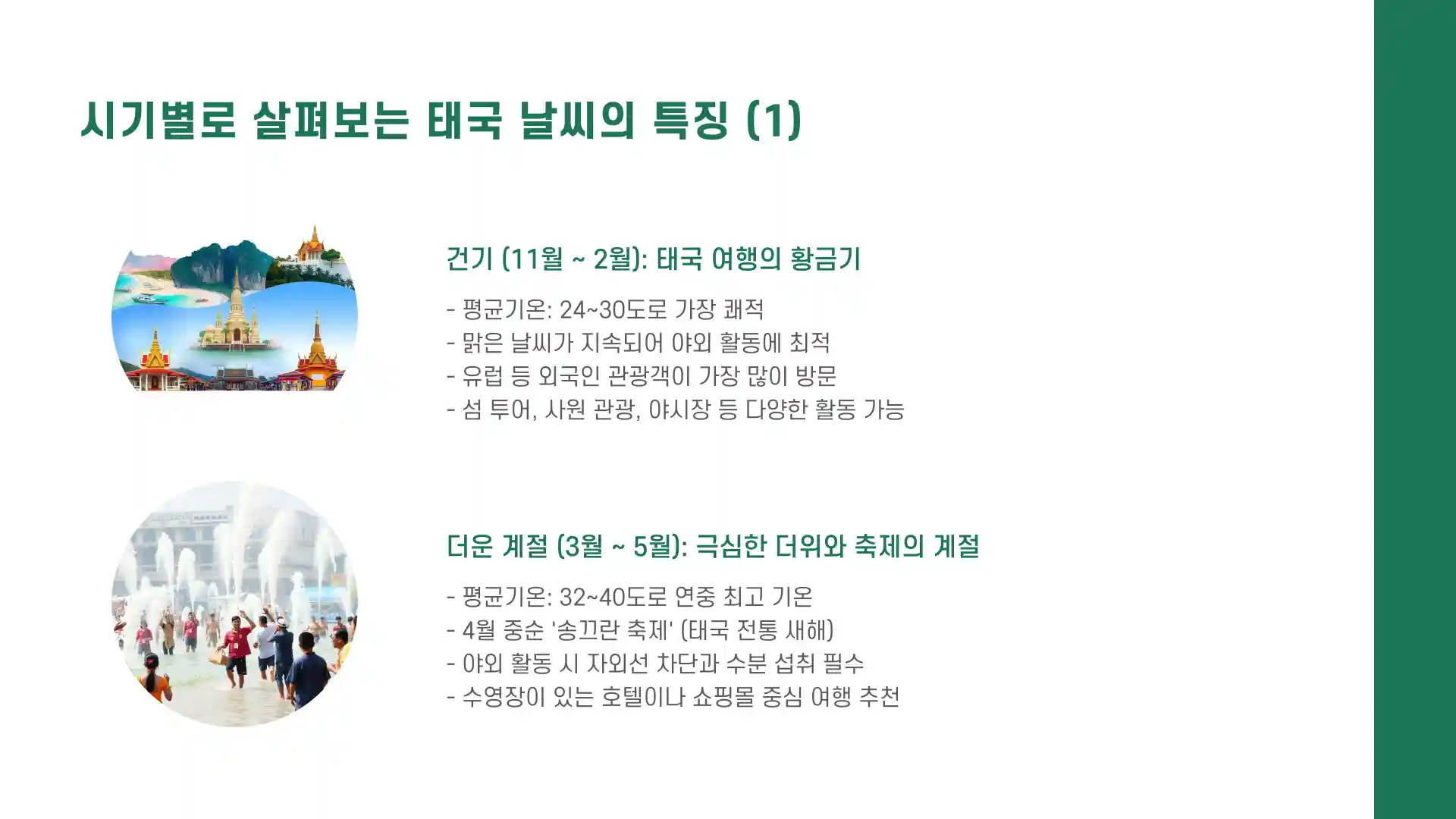 | 더운 계절 특징 | 고온 다습, 송끄란 축제 시즌, 실내 활동 위주 추천 |
